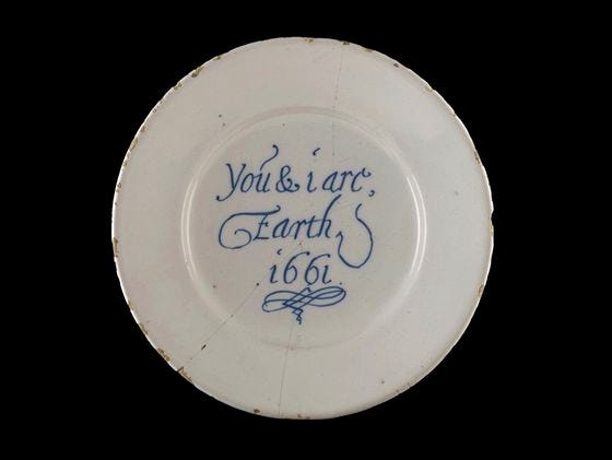 Tin-glazed earthenware plate found in a London sewer, displayed in the Wellcome Collection’s Dirt exhibition.